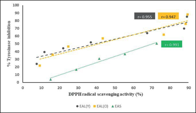 ArticleViewAbstractPharmacognosy Journal,2025,17,4,420-424.DOI:10.5530/pj.2025.17.52Published:August 2025Type:Original ArticleAntioxidant Activity and Tyrosinase Inhibition of Avocado (Persea americana Mill.) Leaves and Seeds ExtractsShalina Sebayang, Raendi Rayendra, Ietje Wientarsih, and Bambang Pontjo Priosoeryanto Shalina Sebayang1*, Raendi Rayendra2, Ietje Wientarsih3, Bambang Pontjo Priosoeryanto3 1Doctoral Program of Animal Biomedical Sciences Graduate School of IPB University, Bogor, INDONESIA 2Faculty of Medicine, Syarif Hidayatullah Islamic University, Jakarta, INDONESIA 3Division of Veterinary Pathology, School of Veterinary Medicine and Biomedical Sciences of IPB University, Bogor, INDONESIA Abstract:Background: Ultraviolet radiation (UVR) can stimulate melanin production in the skin, leading to hyperpigmentation. One way to reduce melanin formation is by inhibiting the enzyme tyrosinase. Often discarded as waste, avocado leaves and seeds are rich in flavonoids with potential tyrosinase-inhibiting properties. Objectives: This study aimed to perform phytochemical screening, measure antioxidant and tyrosinase inhibitor activities, and explore the correlation between free radical scavenging and tyrosinase inhibition in ethanol extracts of young avocado leaves (EAL(O)) and old avocado leaves (EAL(Y)), as well as the ethyl acetate extract of avocado seeds (EAS). Methods: Antioxidant activity was assessed using the 2,2-Diphennyl-1-picrylhydrazyl (DPPH) method, while tyrosinase inhibition was evaluated in vitro with mushroom tyrosinase and L-DOPA as a substrate. Results: The results of the antioxidant activity test using the DPPH method yielded IC50 values for EAL(Y), EAL(O), and EAS of 17.9±0.15 μg/mL, 15.33±0.02 μg/ mL, and 745.66±6.08 μg/mL, respectively. Tyrosinase inhibition tests indicated that EAL(Y), EAL(O), and EAS could significantly inhibit tyrosinase activity (P <0.01), with IC50 values of 10133.26±140.12 μg/mL, 8496.20±155.06 μg/mL, and 48375.8±553.06 μg/mL, respectively. The correlation coefficients between tyrosinase inhibition and antioxidant activity for EAL(Y), EAL(O), and EAS were r = 0.955, r = 0.947, and r = 0.991, respectively. Conclusion: These findings suggest that EAL(Y), EAL(O), and EAS may be potential natural skin-whitening agents due to their flavonoid content and antioxidant and anti-tyrosinase properties. Keywords:Persea americana Mill; tyrosinase inhibition; DPPH; L-DOPAView:PDF (464.52 KB) PDF Images Correlation between mushroom tyrosinase inhibition and free radical scavenging activity EAL(Y), EAL(O), and EAS ‹ Mechanistic Insights on the Neuro-Modulatory Potential of Cannabis sativa: A Network Pharmacology- and Molecular Dynamics Simulation-Based Approach up Traditional claims to Scientific Evidence: A Analysis of Trachyspermum ammi ›
