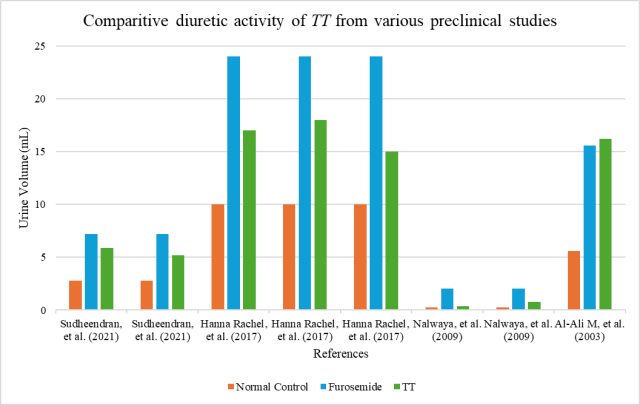 ArticleViewAbstractPharmacognosy Journal,2025,17,5,653-661.DOI:10.5530/pj.2025.17.82Published:September 2025Type:Review ArticleTribulus terrestris: A Revisit to a Promising Herbal DiureticAmruth Kiran, Praveen Kumar S E, Devasrita Dash, Govindasamy Suresh, Vasudev R Pai, Arul Amuthan, and K Ganesh Shenoy Amruth Kiran1, Praveen Kumar S E2, Devasrita Dash1, Govindasamy Suresh1, Vasudev R Pai3, Arul Amuthan1,4*, K Ganesh Shenoy1 1Department of Basic Medical Sciences, Manipal Academy of Higher Education, Manipal, INDIA. 2Department of Pharmacology, Manipal Tata Medical College, Manipal Academy of Higher Education, Manipal, INDIA. 3Department of Pharmacognosy, Manipal College of Pharmaceutical Sciences, Manipal Academy of Higher Education, Manipal, INDIA. 4Coordinator, Division of Siddha, Centre for Integrative Medicine and Research (CIMR), Manipal Academy of Higher Education, Manipal, Karnataka, India Abstract:Background: Standard diuretics are essential for managing fluid as well as electrolyte overload and hypertension but are frequently associated with adverse effects such as electrolyte imbalances, renal dysfunction, and metabolic disturbances. This has prompted increased interest in safer, plant-based alternatives. Tribulus terrestris, a medicinal herb used as a diuretic agent in traditional systems, has shown promising diuretic activity in recent experimental studies. Objective: To provide an outline and assess the reported diuretic effects of Tribulus terrestris, including its phytochemical profile, mechanisms of action, and findings from in vivo, in vitro, and in silico studies. Methods: An extensive literature survey was performed on the PubMed, Scopus, ScienceDirect, and Google Scholar databases for studies published between 2000 and 2025. The inclusion criterion was original articles evaluating the diuretic activity of Tribulus terrestris. Articles without diuretic activity were excluded. Data extraction included the plant part used, extract type, dosage, model used and observed effects. Results: This review highlights the diuretic properties and phytoconstituents of Tribulus terrestris. Most studies have used aqueous or ethanolic extracts of fruits or whole plants and reported significant increases in urine output and urinary sodium excretion, which are often comparable to those of standard diuretics such as furosemide. Conclusion: This review highlights the preclinical diuretic activity of Tribulus terrestris. It has shown effective and welltolerated diuretic potential in preclinical and human subjects. It is a promising, likely herbal-based diuretic, natural alternative or complement, adjunct to conventional diuretics, which warrants further investigation through clinical studies. Keywords:diuresis, diuretic agent, Herbal medicine, Indian traditional medicine, Siddha system of medicine, Tribulus terrestrisView:PDF (442.85 KB) PDF Images Effect of various extracts of TT on the urinary output when compared with the normal control and furosemide ‹ Hydrolyzed Collagen Tonic Drink Prevents Worsening of Skin Parameters and Improves Photoaging Classification in Healthy Thai Women: A Randomized Controlled Trial up