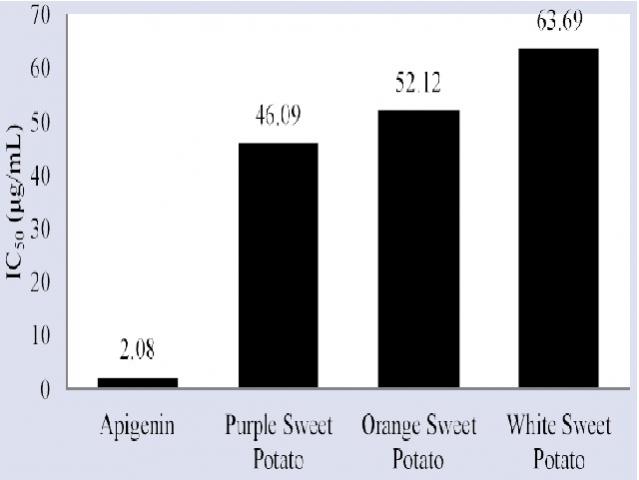 ArticleViewAbstractPharmacognosy Journal,2019,11,6,1195-1198.DOI:10.5530/pj.2019.11.185Published:October 2019Type:Original ArticleInhibitory Effects of Different Varieties of Sweet Potato (Ipomoea batatas L.) Tubers Extracts on Lipoxygenase ActivitySendangratri, Rosita Handayani, and Berna Elya Sendangratri1, Rosita Handayani1, Berna Elya1,* 1Laboratory of Pharmacognosy- Phytochemistry, Faculty of Pharmacy, Universitas Indonesia, Depok, West Java, INDONESIA. Abstract:Background: Sweet potatoes (Ipomoea batatas L.) with purple, orange and white varieties can be differentiated by their skin and flesh tubers’ colors. Research on anti-inflammatory activity of this plant is still limited although has been used traditionally. Objective: This study aimed to determine IC50 value of sweet potato tubers extracts in inhibiting lipoxygenase activity. Methods: Dried tubers of sweet potato were macerated with ethanol 70%. Each extracts were tested for soybean lipoxygenase inhibitory activity, phytochemical screening and total flavonoid contents. IC50 value and total flavonoid contents obtained from each extracts were analyzed statistically. Results: IC50 value of purple, orange and white sweet potato tubers extracts are 46.09, 52.12 and 63.69 μg/mL respectively. Each extracts contain alkaloids, flavonoids, saponins, tannins and glycosides. Total flavonoid contents in purple, orange and white sweet potato extracts are 8.45±0.41; 7.57±0.03; and 6.12±0.14 mgQE/g extract respectively. Conclusion: Total flavonoid contents and IC50 values of each extracts are strongly correlated and inversely proportional with significance value of 0.026 and correlation value of -0.999 which indicate that the higher total flavonoid contents, the stronger inhibitory activity. Keywords:Anti-inflammatory, Ipomoea batatas L, Lipoxygenase, Sweet potato tubers, Total flavonoid contentsView:PDF (261.44 KB) PDF Images Results of inhibition of lipoxygenase activity by standard and extracts ‹ HerbalDB 2.0: Optimization of Construction of Three-Dimensional Chemical Compound Structures to Update Indonesian Medicinal Plant Database up Effect of Beta Glucosidase Inhibitor from Lichen Extract in Microcrystalline Cellulose Preparation from Water Hyacinth (Eichhornia crassipes) ›