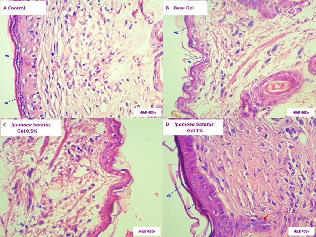 ArticleViewAbstractPharmacognosy Journal,2021,13,6s,1720-1726.DOI:10.5530/pj.2021.13.222Published:December 2021Type:Research ArticleEffect of a Gel Based on Ipomoea batatas (Purple Sweet Potato) on Dermal Wound Healing in MiceCarmen R. Silva-Correa, Cristel M. Ortiz-Noriega, Víctor E. Villarreal-La Torre, Abhel A. Calderón-Peña, Cinthya L. Aspajo-Villalaz, Luz M. Guerrero-Espino, William A. Sagástegui-Guarniz, Anabel D. González- Siccha, María V. González-Blas, José L. Cruzado-Razco, Jorge Del Rosario-Chávarri, Patricia Contreras- Vera, and Julio Hilario-Vargas Carmen R. Silva-Correa1,*, Cristel M. Ortiz-Noriega1, Víctor E. Villarreal- La Torre1, Abhel A. Calderón-Peña2, Cinthya L. Aspajo-Villalaz2, Luz M. Guerrero-Espino3, William A. Sagástegui-Guarniz1, Anabel D. González-Siccha1, María V. González-Blas1, José L. Cruzado- Razco1, Jorge Del Rosario- Chávarri2, Patricia Contreras-Vera4, Julio Hilario-Vargas3 1Facultad de Farmacia y Bioquímica, Universidad Nacional de Trujillo, PERÚ. 2Facultad de Ciencias Biológicas, Universidad Nacional de Trujillo, PERÚ. 3Facultad de Medicina, Universidad Nacional de Trujillo, PERÚ. 4Hospital Víctor Lazarte Echegaray, Trujillo, PERÚ. Abstract:Background: Ipomoea batatas (L.) Lam. (I. batatas) is a root native from South America that is characterized by its antioxidant, antimicrobial and anti-inflammatory properties. These properties contribute to the wound healing process. Objective: To evaluate the healing activity of a gel based on I. batatas on dermal wound healing in mice. Material and methods: An acid ethanolic extract (1.5 N hydrochloric acid: Ethanol 96 ° 15:85, v / v) was prepared with the peels of the roots of I. batatas "purple sweet potato", which was incorporated into the formulations 0.5% and 1% gel. Mus musculus Balb / c with induced injury were distributed in four experimental groups: Group I (Control), which did not receive any treatment. Group II (Gel base), Group III (Gel I. batatas 0.5%) and Group IV (Gel I. batatas 1%) received the daily administration of topical treatments for 14 days. Wound closure was determined during the experimentation time, then they were euthanized with sodium pentobarbital 60 mg / kg / pc v.ip. to obtain skin samples for histopathological analysis. Results: Group IV shows a higher percentage of wound closure, which is also evidenced in histopathological changes. Conclusions: The 1% gel based on the ethanolic extract of the peels of the roots of Ipomoea batatas (L.) Lam. they show healing activity in wounds induced in mice, being the most effective treatment. Keywords:Histology, Ipomoea batatas, Skin., Wound HealingView:PDF (5.04 MB) PDF Images Histopathological sections of the skin of Mus musculus Balb / c. A. Group I (Control). B. Group II. (Base Gel). C. Group III (Gel I. batatas 0.5%). D. Group IV (Gel I. batatas 1%). Keratinous stratum corneum (ec), stratum granulosa (eg), stratum spinosum (ee), basal cells (eb) dermal papillae (arrow), fibroblasts (*), sweat glands (gs), eschar (s). (Hematoxylin and Eosin stained, 400X). ‹ In silico Study on the Promising Active Components of Terpenoid and Fucoidon from Sargassum sp. in Inhibiting CGRP and TNF-α up Effect of a Gel Based on Ipomoea batatas (Purple Sweet Potato) on Dermal Wound Healing in Mice ›