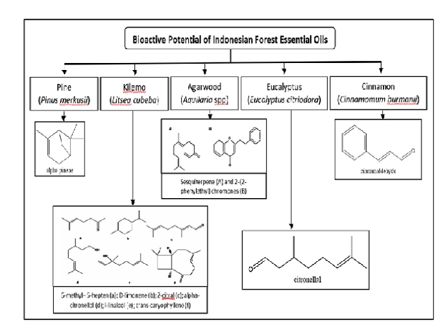 ArticleViewAbstractPharmacognosy Journal,2022,14,6,873-879.DOI:10.5530/pj.2022.14.182Published:December 2022Type:Review ArticleReview on Bioactive Potential of Indonesian Forest Essential OilsYelfi Anwar, Gunawan Pasaribu, and M. Nazari V Yelfi Anwar1,*, Gunawan Pasaribu2, M. Nazari V1 1School of Pharmacy, University August 17, 1945, Jakarta, INDONESIA. 2Research Center for Biomass and Bioproducts, National Research and Innovation Agency, Jakarta, INDONESIA. Abstract:Essential oils are composed of some natural, volatile, as well as aromatic compounds extracted from plants. In recent years, several studies have shown that some of their benefits can be attributed to their antimicrobial, antioxidant, anti-inflammatory, and also immunomodulatory properties. So, essential oils have been proposed as a common elective to anti-microbials or for utilize in combination with other antimicrobials against multidrug-resistant microscopic organisms. Most of the potential data about essential oils were obtained with in vitro and in vivo studies. Several types of essential oils are available in Indonesia which are reported to have biological activity such as antioxidants and antiaging are essential oils of pine (Pinus merkusii), kilemo (Litsea cubeba), agarwood (Aquilaria spp), eucalyptus (Eucalyptus citriodora), and cinnamon (Cinnamomum burmanii). The major chemical compound of pine oil is alpha pinene. Kilemo oil contains geranial. chemical marker compound of agarwood is chromone and sesquiterpenes. Eucalyptus contains citronella. The chemical component of cinnamon oil is cinnamaldehyde. Some essential oils have shown remarkable antioxidant activities when used at specific concentrations which can be due to their richness in phenolic compounds. However, toxicological studies are needed before any recommendation for application can be given. Preformulating and formulation studies will be needed to develop suitable dosage forms in order to introduce optimized pharmaceuticals (high active, low toxic) as alternative of current pharmaceutical dosage forms Keywords:Bioactivity, Chemical compound, Essential oil, Indonesian forest, PharmaceuticsView:PDF (1.2 MB) PDF Images Graphical Abstract ‹ The Ethanolic Extract of Rhinachantus nasutus (L.) Kurz Flower has Antioxidant, Anti-Gout, and Antibacterial Potential up
