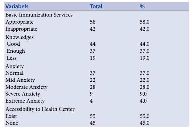 ArticleViewAbstractPharmacognosy Journal,2023,15,6,1005-1009.DOI:10.5530/pj.2023.15.185Published:December 2023Type:Original ArticleImmunization During the Covid-19 PandemicYuniarti, Rusmilawaty, Tri Tunggal, Norlaila Sofia, Nur Rohmah Prihatanti, Ahmad Rizani, and Anwar Mallongi Yuniarti1,*, Rusmilawaty1 , Tri Tunggal1 , Norlaila Sofia1 , Nur Rohmah Prihatanti1 , Noor Adha Aprilea1 , Ahmad Rizani1 , Anwar mallongi2 1Midwifery Departement, Ministry of Health Republic of Indonesia, INDONESIA. 2Faculty of public health, University of Hasanuddin, INDONESIA. Abstract:Objectives: This Study Aims to Analyze the Determinant Factors Associated with Basic Immunization Services for Infants Aged 1-12 Months in Banjarbaru City During the Covid 19 Pandemic. Methods: The Research Design Is an Analytic Research with A Cross Sectional Approach. The Independent Variables Are Mother's Knowledge, Mother's Anxiety, And Accessibility to Health Facilities, And the Dependent Variable Is Basic Immunization Services. The Research Sample Consisted Of 100 Respondents Who Had Babies Aged 1-12 Months in The Cempaka Health Center, Sungai Ulin Health Center, Sungai Besar Health Center and South Banjarbaru Health Center. The Sampling Technique Was Non-Probability Sampling, Namely Purposive Sampling. The Instruments Used Were A Knowledge Questionnaire, An Anxiety Questionnaire (Dass) And an Accessibility Questionnaire in The Form of a Google Form. Analysis Using the Chi Square Statistical Test. Results: The Results Showed That 58 People (58.0%) Had Basic Immunization Services According to Age, 44 People (44.0%) Had Good Knowledge And 55 People (55.0%) Had Accessibility to Health Facilities. Variables Related to Basic Immunization Services in Banjarbaru City Were Knowledge (P=0.03) And Anxiety (P=0.01). Another Variable in This Study, That Is Accessibility to Health Services, Was Not Related to Basic Immunization Services in Banjarbaru City (P=0.80). Conclusions: It Is Recommended That Basic Immunization Information and Services Be More Proactive. Health Promotion Uses an Interpersonal Approach in The Community to Increase Knowledge, Attitudes and Change People's Behavior. Keywords:Accessibility, Anxiety, Health Center, Immunization, knowledgeView:PDF (176.09 KB) PDF Images The relationship of knowledge, anxiety and accessibility to health facilities with basic immunization services in Banjarbaru city. ‹ Phytochemical Screening and Antioxidant Activity in Dragon Fruit Plant Extracts as Immunomodulators in Pregnant Women up Comparison of Hb Levels Given Iron Supplements with and Without Vitamin B12 to Anemia Female Industrial Workers in Surakarta Residency Area ›