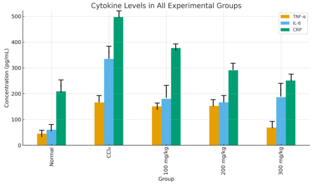 ArticleViewAbstractPharmacognosy Journal,2025,17,6,751-759.DOI:10.5530/pj.2025.17.94Published:December 2025Type:Original ArticleUltrasonographic and Biochemical Evaluation of the Hepatoprotective Effect of Cinnamomum burmannii Bark Extract in Carbon Tetrachloride–Induced Liver InjuryInda Kania Meilani, Ermi Girsang, and Yolanda Eliza Putri Lubis Inda Kania Meilani1*, Ermi Girsang2, Yolanda Eliza Putri Lubis3 1Doctoral Program, Faculty of Medicine, Dentistry, and Health Science, Universitas Prima Indonesia, Medan 20118, INDONESIA. 2Department of Biochemistry and Molecular Biology, Faculty of Medicine, Dentistry, and Health Science, Universitas Prima Indonesia, Universitas Prima Indonesia, Medan 20118, INDONESIA. 3Department of Public Health and Preventive Medicine, Faculty of Medicine, Dentistry, and Health Science, Universitas Prima Indonesia, Universitas Prima Indonesia, Medan 20118, INDONESIA. Abstract:This study aimed to evaluate the hepatoprotective activity of ethanolic extract of cinnamon (Cinnamomum burmannii) in male Wistar rats induced with carbon tetrachloride (CCl₄). Cinnamon extract is known to contain bioactive compounds such as flavonoids and polyphenols, which play significant roles in antioxidant and anti-inflammatory mechanisms. Phytochemical analysis revealed that the extract contained total phenolic content of 71.55 mg GAE/g and flavonoid content of 0.41 mg QE/g, with a potent antioxidant activity indicated by an IC₅₀ value of 18.19 ppm. Administration of the extract for 28 days at a dose of 300 mg/kg body weight resulted in a significant reduction (P<0.05) in pro-inflammatory cytokines TNF-α, IL-6, and CRP levels compared to the negative control group. The 300 mg/kg dose showed the highest efficacy, with TNF-α levels approaching those of the normal group. Furthermore, liver function parameters improved, as evidenced by significant reductions in SGOT and SGPT enzyme levels, an increase in serum albumin (2.96 ± 0.52 g/dL), and a decrease in serum bilirubin to 0.102 ± 0.040 mg/dL. Ultrasonographic examination showed improved liver parenchymal homogeneity and a reduction in the number of nodules. Histopathological findings revealed a decrease in liver tissue damage score from moderate to mild. These findings suggest that Cinnamomum burmannii extract has potential hepatoprotective effects through antiinflammatory, antioxidant, and hepatocellular recovery mechanisms. Therefore, this extract holds promise as a phytopharmaceutical candidate for complementary therapy in liver function disorders; however, further studies are required to isolate the active compounds and evaluate long-term toxicity. Keywords:Anti-inflammatory, Antioxidant, Cinnamon, Cytokine, Hepatoprotective, HistopathologyView:PDF (995.66 KB) PDF Images Cytokine levels in all experimental groups ‹ Hepatoprotective Potential of Coffea arabica Extract Against Carbon Tetrachloride Induced Liver Damage: Ultrasonographic and Cytokine Evaluation up Protective Role of Centella asiatica Extract Against Carbon Tetrachloride–Induced Hepatic Damage: A Biochemical and Ultrasonographic Study ›